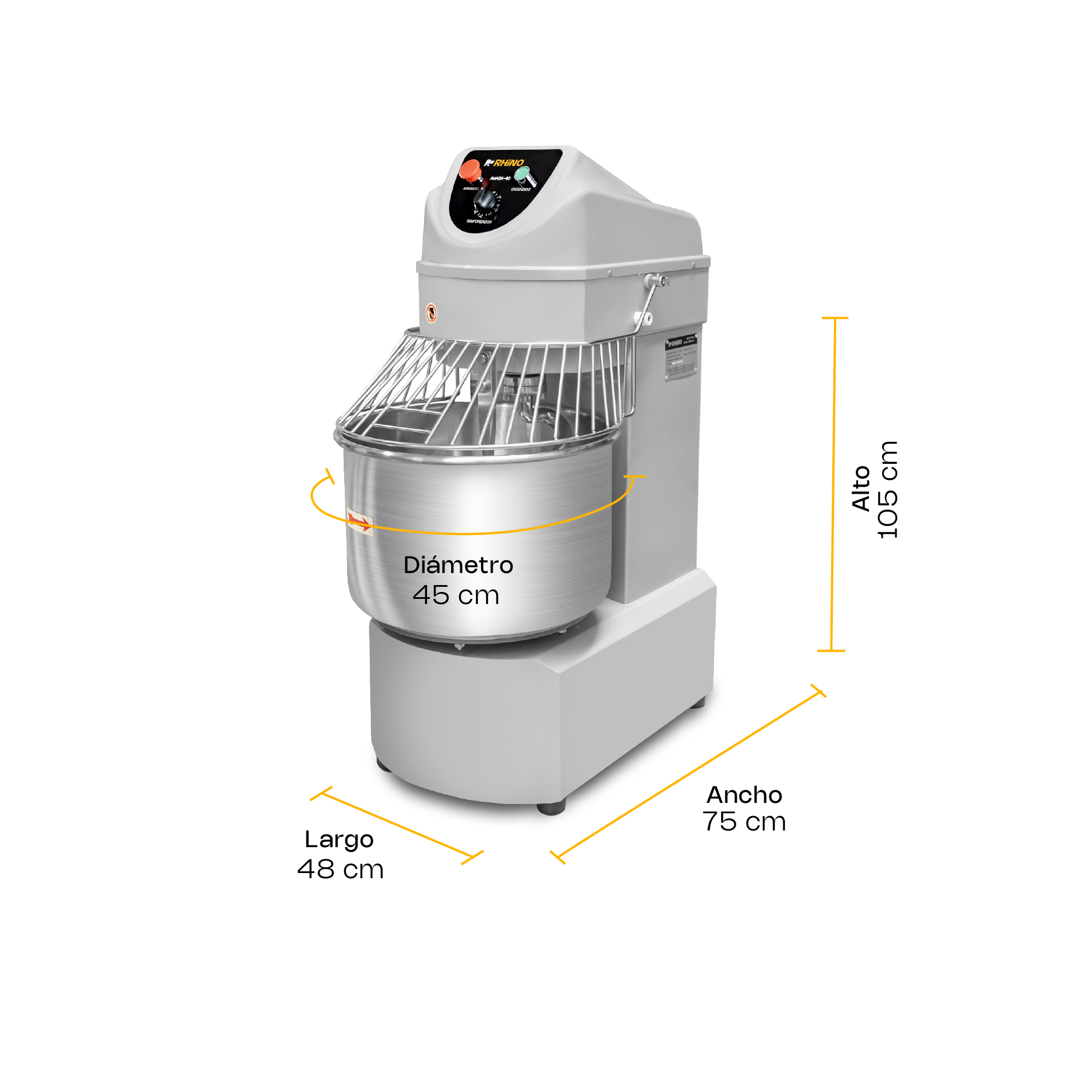 Un crecimiento rentable exige maquinaria robusta que soporte el ritmo intenso de tu negocio. Conoce las especificaciones técnicas y dimensiones que convierten a la Amasadora Industrial 40 Litros Rhino AMASA-40 en el verdadero motor de tu área de producción: