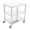 Fabricado en acero inoxidable tipo 201 de 1 mm, con cubierta y dos entrepaños, monta sobre 4 ruedas, dos con freno. Soporte inferior de la cubierta en termoplástico. (ensamblable).