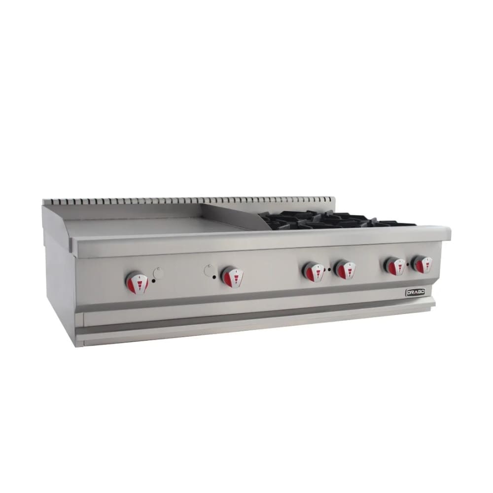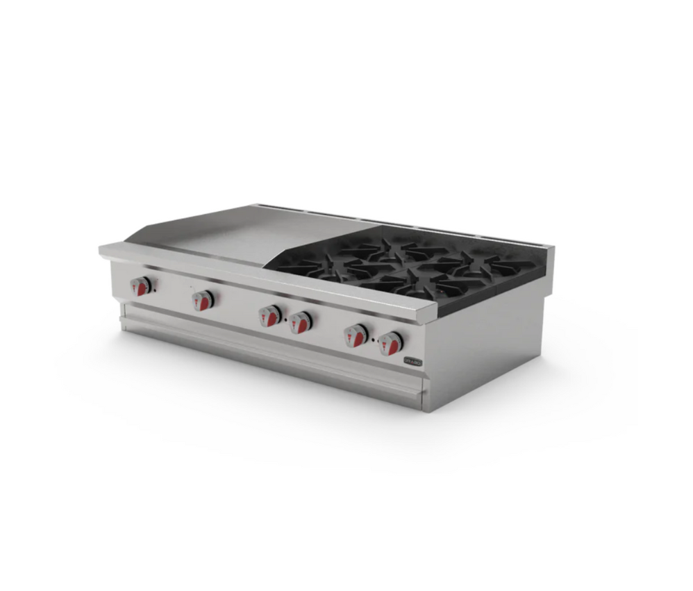 • La repisa de acero inoxidable está enrollada en una sola pieza para su limpieza.conveniencia. • Perfil de coincidencia de rango cuando se coloca sobre una base refrigerada o soporte de equipo. • Las perillas de control son de plástico duradero y empuñadura de protección contra el calor.
