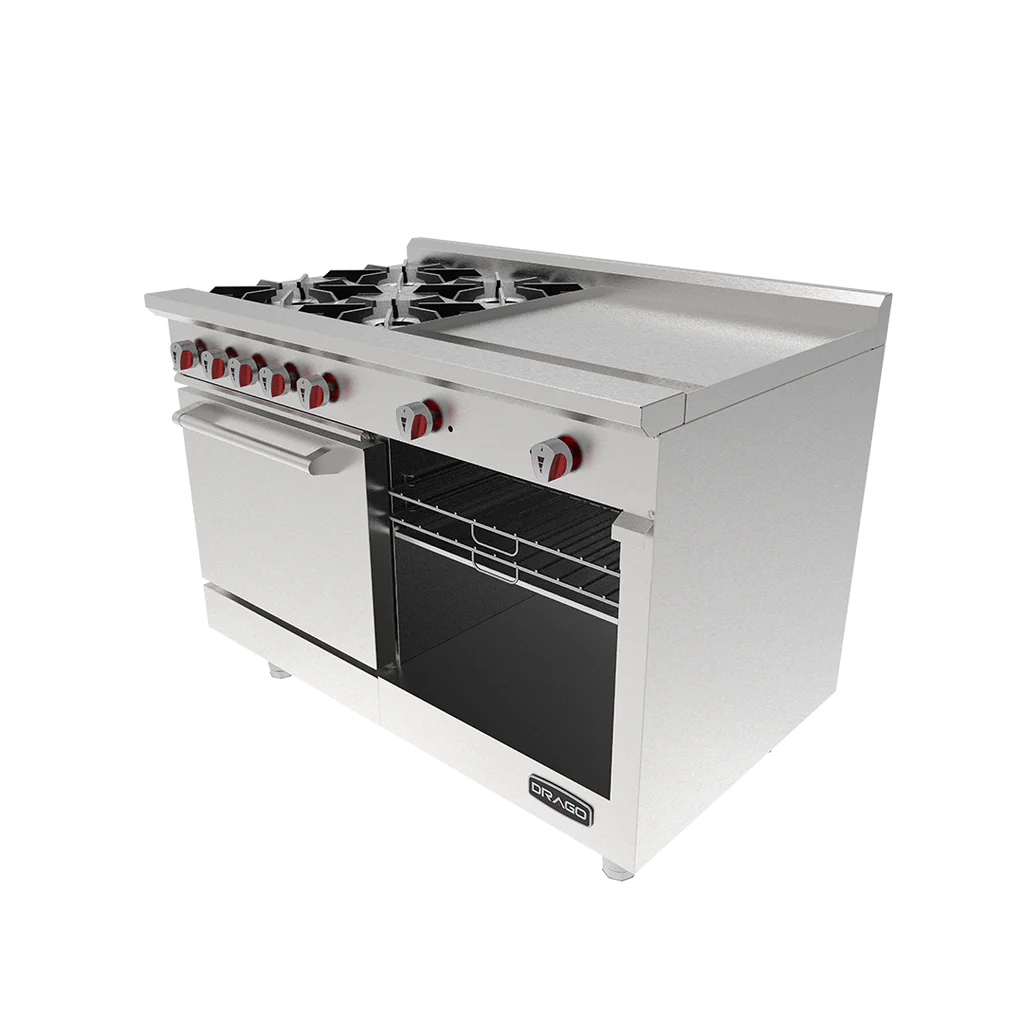 Horno: • Interior fabricado en lámina aluminizada • Termostato importado, rango de 100 a 300 °C, con válvula de seguridad integrada • Quemador Potente de 51mm de diámetro de acero inoxidable con capacidad calorífica de 20,000 btu/hr • 2 parrillas cromadas en 5 niveles diferentes