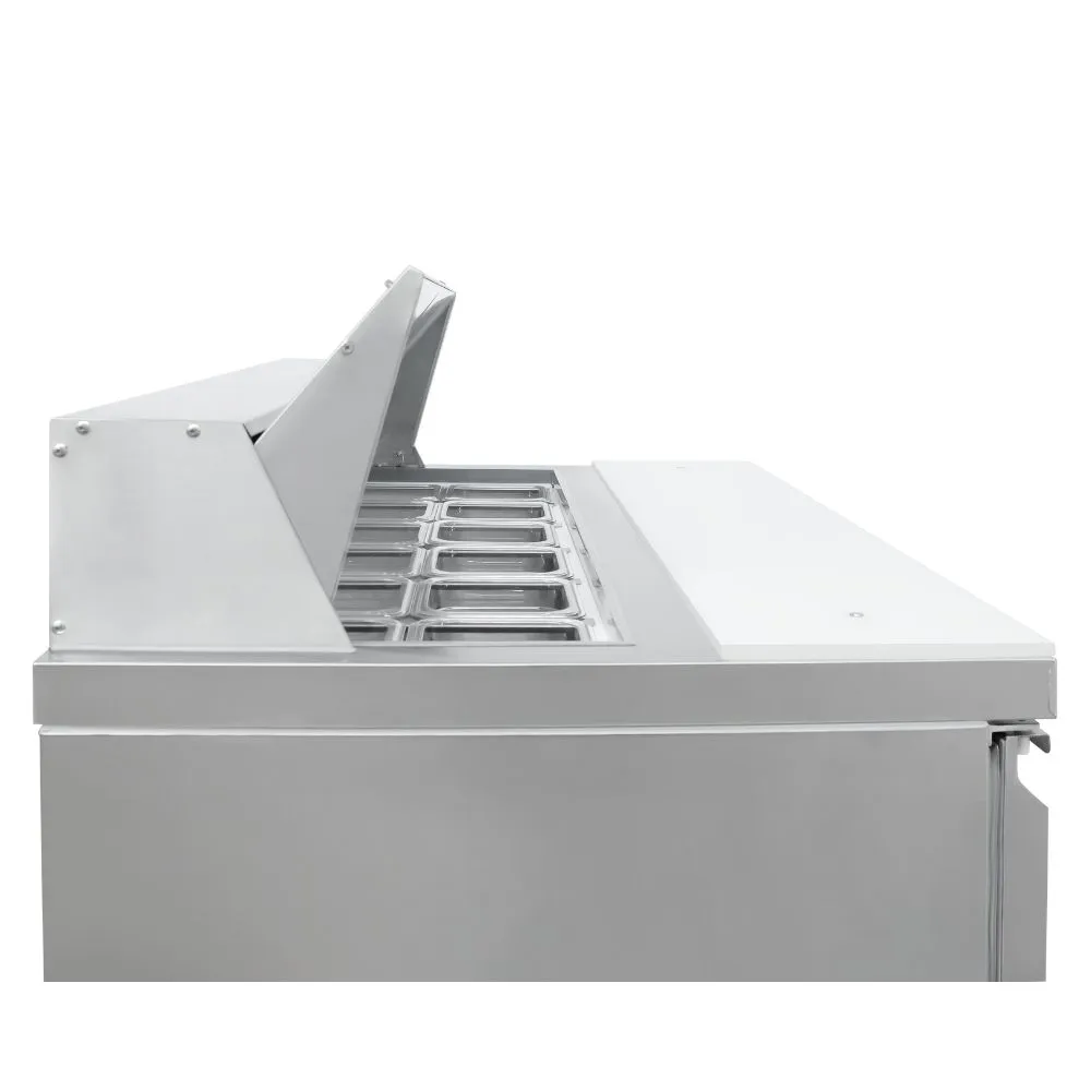Zona de Preparación: Tabla de corte higiénica a lo largo de todo el frente y espacio superior refrigerado para alojar insertos gastronómicos.