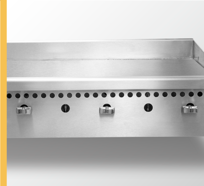 • Quemador de acero aluminizado en forma de U de 25,000 BTU/hr por cada 12″ (30.48 cm) de ancho de la plancha.