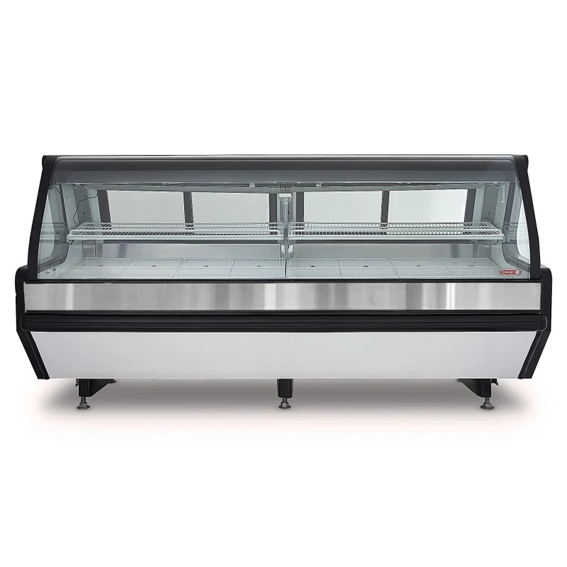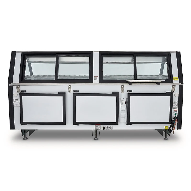 Vitrina carnicera modular de 2.5 m de largo color blanca, con ventanas laterales de vidrio y puertas posteriores de vidrio para exhibición panorámica, con almacén inferior para congelamiento y techo mostrador, ideal para grandes cadenas de autoservicios y carnicerías grandes.
